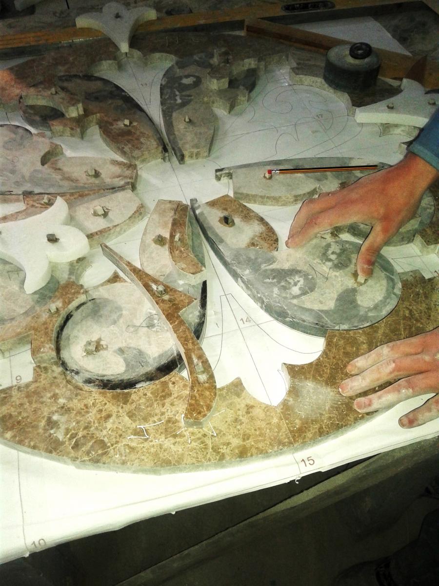 И вот когда уже большая часть работы сделана, ты понимаешь, что белая середина из мрамора Thassos, совсем не смотрится. Убираешь уже вырезанный белый кружок и заменяешь его на терракотовый.